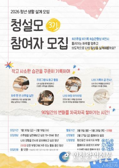 유유기지 부평 관계자는 “청설모는 청년들이 자신의 생활을 주도적으로 설계하고, 기록을 통해 변화를 체감할 수 있도록 돕는 프로그램”이라며 “함께 실천하고 서로를 응원하는 과정을 통해 청년들의 일상에 긍정적인 변화가 쌓이길 기대한다”고 말했다.