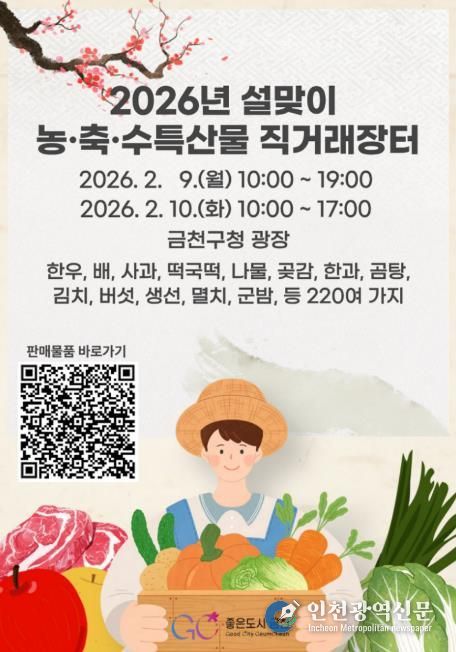 [인천광역신문] 관리자 기자 | 금천구는 설 명절을 앞두고 9일부터 10일까지 이틀간 금천구청 광장에서 ‘2026년 설맞이 농·축·수특산물 직거래장터’를 연다고 밝혔다.