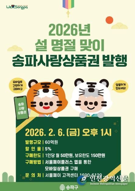 서강석 송파구청장은 “명절을 앞두고, 구민들이 장보기와 외식 등 상황에 맞춰 상품권을 유연하게 활용하실 수 있도록 발행 체계를 세심하게 준비했다”며, “지역 상품권을 통해 위축된 소비심리를 되살리고, 소상공인의 매출 증대로 이어져 지역사회 경제 선순환에 도움이 되길 바란다.”고 전했다.