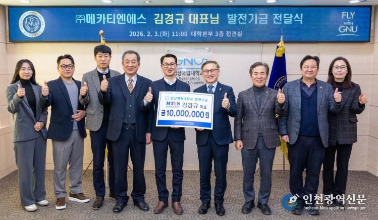 [인천광역신문] 관리자 기자 | 경상국립대학교는 2월 3일 오전 11시 대학본부 3층 접견실에서 ㈜메카티엔에스 김경규 대표가 대학발전기금 1000만 원을 기부했다고 밝혔다.