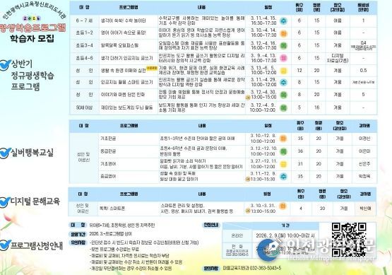 [인천광역신문] 관리자 기자 | 인천광역시교육청신트리도서관은 지역 주민의 생애주기별 학습 기회 제공을 위해 2026년 상반기 평생학습프로그램 학습자를 모집한다.