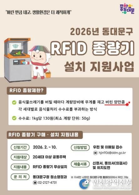 [인천광역신문] 관리자 기자 | 동대문구는 음식물류 폐기물을 줄이고 쾌적한 주거환경을 만들기 위해 ‘2026년 공동주택 음식물 쓰레기 RFID 종량기 설치 지원 사업’을 확대 추진한다.