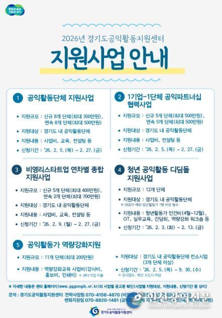 [인천광역신문] 관리자 기자 | 경기도공익활동지원센터가 ‘2026년 경기도 공익활동 지원사업’에 참여할 도내 공익활동 단체를 모집한다.