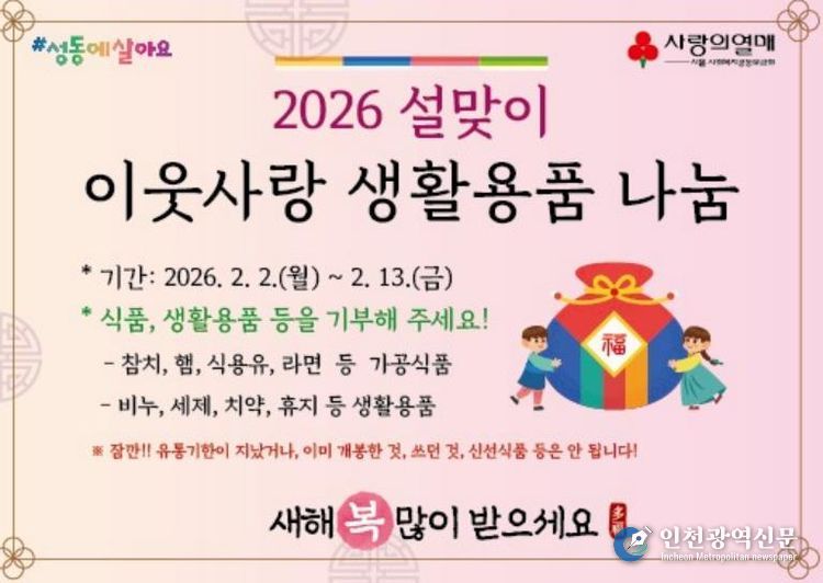 [인천광역신문] 관리자 기자 | 서울 성동구는 다가오는 설 명절을 맞아 누구도 소외되지 않는 따뜻한 명절을 만들기 위해 오는 2월 13일까지 생활용품과 식료품을 기부하는 '2026 설맞이 이웃사랑 생활용품 나눔 사업'을 추진한다.