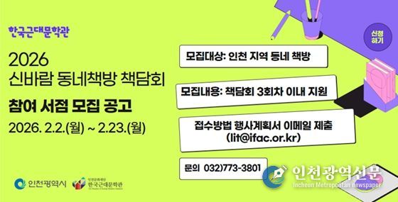 [인천광역신문] 관리자 기자 | 인천문화재단 한국근대문학관은 인천 지역 동네책방과 함께하는 2026년 '신바람 동네책방 책담회' 참여서점을 모집한다.