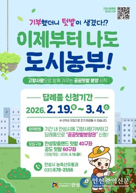 [인천광역신문] 관리자 기자 | 안성시는 오는 2월 19일부터 고향사랑기부제를 통해 도시농업을 체험하는 ‘도시농부’를 모집한다고 밝혔다.