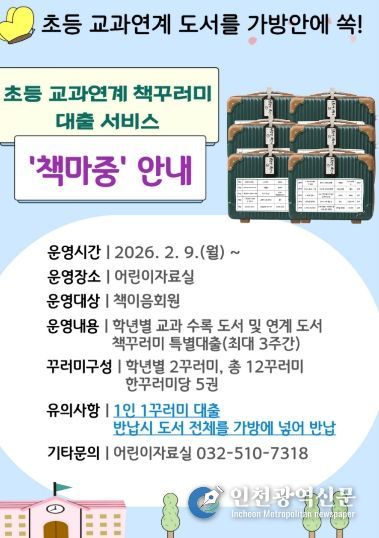 [인천광역신문] 관리자 기자 | 인천광역시교육청부평도서관은 9일부터 어린이자료실에서 초등교과 연계 책꾸러미 대출 서비스 ‘책마중’을 운영한다.