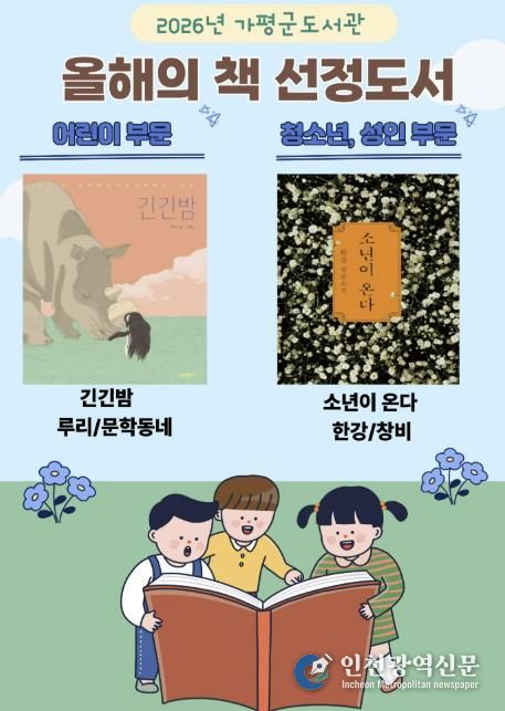 [인천광역신문] 관리자 기자 | 가평군도서관이 군민의 독서 문화 확산을 위해 ‘2026년 올해의 책’으로 루리 작가의 『긴긴밤』과 한강 작가의 『소년이 온다』를 선정했다.
