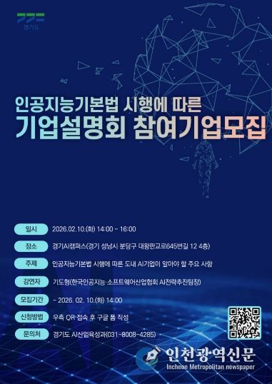 [인천광역신문] 관리자 기자 | 경기도가 지난 1월 22일 시행된 ‘인공지능 기본법’에 대한 도내 기업들의 이해를 돕기 위해 10일 오후 2시 판교 경기AI캠퍼스에서 AI 기업 대상 설명회를 개최한다.