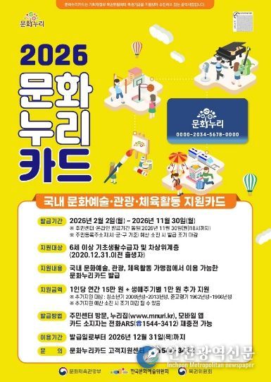 [인천광역신문] 관리자 기자 | 경기도가 6세 이상 기초생활수급자나 차상위계층의 문화·여행·체육 활동을 지원하기 위해 추진하는 통합문화이용권 ‘문화누리카드’의 지원금이 15만 원으로 전년 대비 1만 원 인상된다.