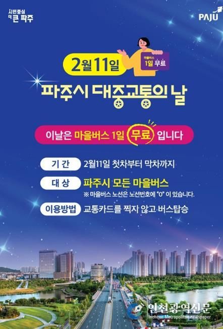 [인천광역신문] 관리자 기자 | 파주시는 ‘대중교통의 날’을 맞아 대중교통 이용 활성화와 시민 교통비 부담 완화를 위해 오는 2월 11일 하루 동안 파주시 전 지역의 모든 마을버스를 무료로 운행한다.