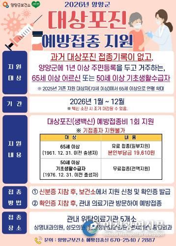 신승주 양양군보건소장은 “예방접종은 대상포진과 합병증을 예방하는 가장 효과적인 방법”이라며 “이번 지원 대상 확대를 통해 더 많은 군민이 경제적 부담 없이 건강을 지키길 바란다”고 말했다.