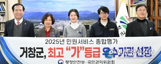 [인천광역신문] 관리자 기자 | 거창군은 국민권익위원회·행정안전부 공동 주관한 ‘2025년 민원 서비스 종합평가’에서 최고 등급인 ‘가등급’에 선정돼 전국 최고 수준의 민원 서비스를 인정받았다.