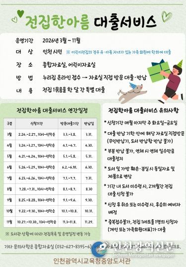 [인천광역신문] 관리자 기자 | 인천광역시교육청중앙도서관은 지역주민에게 다양한 독서 기회를 제공하기 위하여, 3월부터 11월까지 ‘전집한아름 대출서비스’를 운영한다.