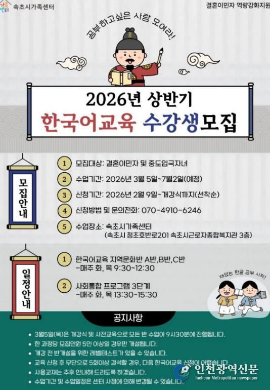 [인천광역신문] 관리자 기자 | 속초시가족센터가 속초시에 거주하는 결혼이민자의 지역사회 정착과 자립을 돕기 위해 상반기 한국어 교육과 운전면허 취득 지원사업 참여자를 모집한다.