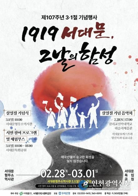 [인천광역신문] 관리자 기자 | 서대문구가 제107주년 삼일절인 3월 1일 서대문독립공원과 서대문형무소역사관 일대에서 ‘1919 서대문, 그날의 함성’을 개최한다. 삼일절 하루 전인 이달 28일에는 감리교신학대학교 웨슬리채플관에서 삼일절 기념음악회도 열린다.