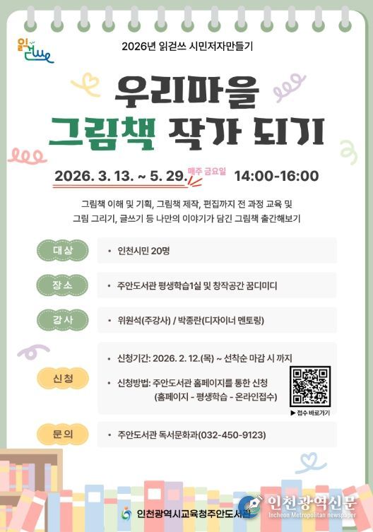 [인천광역신문] 관리자 기자 | 인천광역시교육청주안도서관은 읽걷쓰 시민저자 양성을 위한 ‘우리마을 그림책 작가 되기’ 프로그램 참여자를 모집한다.