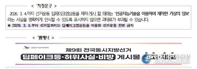 [인천광역신문] 관리자 기자 | 중앙선거관리위원회는 6월 3일 실시하는 제9회 지방선거를 앞두고 유권자 중심의 깨끗한 사이버 선거문화 조성을 위해 2월 3일부터 ‘사이버선거문화 자정캠페인’을 추진 중이라고 밝혔다.