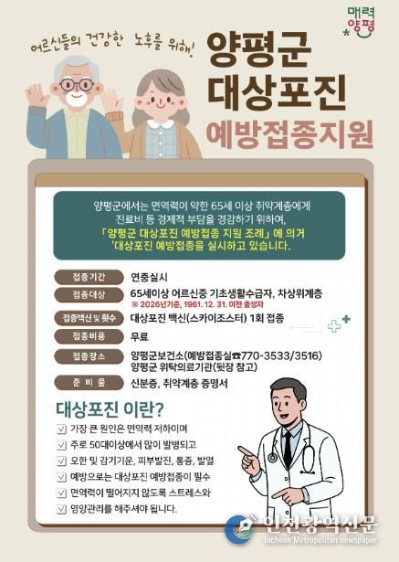 [인천광역신문] 관리자 기자 | 양평군은 지역 내 65세 이상 취약계층(기초생활수급자·차상위계층)을 대상으로 2024년 2월부터 대상포진 예방접종을 무료로 실시하고 있다.