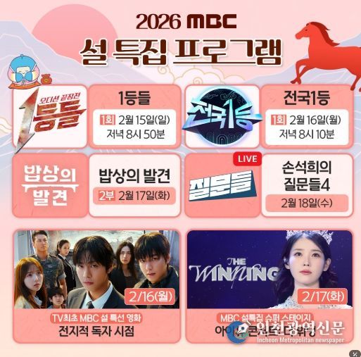 [인천광역신문] 관리자 기자 | MBC가 2026년 설 명절을 맞아 웃음과 감동, 그리고 깊이 있는 이야기를 담은 명절 특집 라인업을 선보인다. 설 연휴의 포문을 여는 신규 프로그램부터 특선영화와 콘서트까지 다채롭게 구성된 이번 설 특집은 연휴 기간을 풍성하게 채울 예정이다.