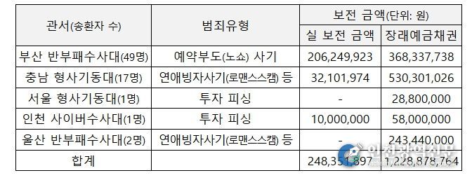 특히, 부산청 반부패수사대에서는 금융회사 28개 대상 484개 계좌를 분석하고, 가상자산, 부동산 보유 명세를 확인하여 부동산 · 자동차 등 5억 7,460만 원(장래예금채권 포함)을 보전 신청했고, 서울청 형사기동대에서는 송환자와 같은 범죄조직에 소속되어 국내에서 인출책으로 활동한 공범 2명까지 추적하여 위 보전 금액과 별도로 737만 원(장래예금채권 포함)을 추가 보전했다.