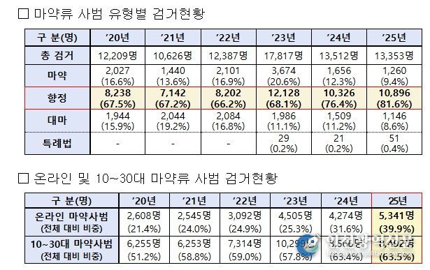 신종 마약류의 대다수에 해당하는 향정신성의약품은 검거 인원이 ’24년 10,326명(76.4%)에서 ’25년 10,896명(81.6%)으로 증가, 압수량은 ’24년 381kg에서 ’25년 448kg으로 증가했으며, 최근 급성장한 온라인 마약 유통시장을 통해 젊은 연령층으로 빠르게 확산하고 있다.