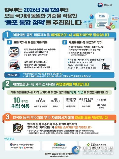 [인천광역신문] 관리자 기자 | 법무부는 2026년 2월 12일 국내․외 체류 동포 사회의 오랜 숙원이었던 '동포 체류자격(F-4) 통합' 조치를 시행한다고 밝혔다.