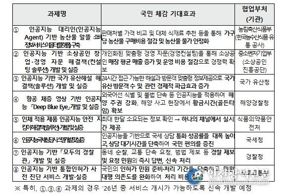 인공지능 민생 10대 과제(프로젝트)'는 국민 효능감이 높은 분야를 중심으로, 국민이 일상에서 인공지능을 체감할 수 있는 서비스를 빠르게 도입하여 인공지능 혁신의 혜택을 확산하기 위한 과제(프로젝트)이다. 공모 신청을 위한 구체적 지원 내용과 선정 절차 등 상세 내용은 과기정통부, 정보통신산업진흥원에서 확인할 수 있다.