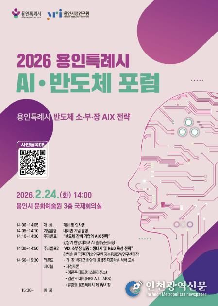 [인천광역신문] 관리자 기자 | 용인특례시는 오는 24일 오후 2시 용인문화예술원 국제회의실에서 ‘반도체 소재·부품·장비(소·부·장) AIX 전략 포럼’을 개최한다.