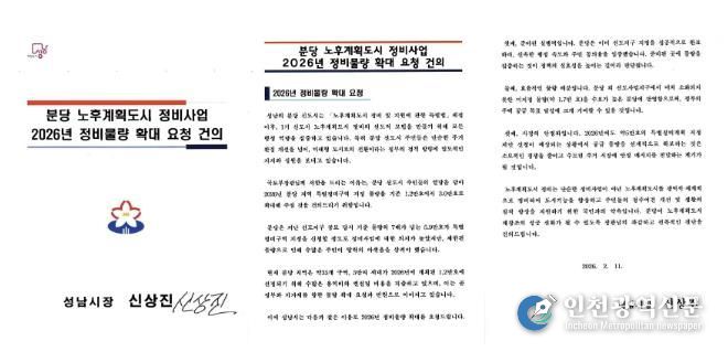 [인천광역신문] 관리자 기자 | 성남시는 ‘노후계획도시 정비 및 지원에 관한 특별법’에 따라 분당 신도시의 원활한 정비사업 추진을 위해, 2026년 특별정비구역 지정 물량을 기존 1만2000호에서 3만 호로 확대해 줄 것을 국토교통부에 공식 건의했다고 12일 밝혔다.