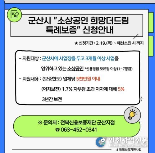 [인천광역신문] 관리자 기자 | 군산시가 장기화된 경기 침체와 고물가로 어려움을 겪고 있는 관내 소상공인들의 자생력 강화와 경영 안정을 위해 ‘2026년 소상공인 특례보증 지원사업’을 본격적으로 시행한다.