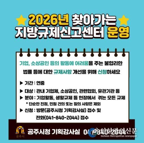 [인천광역신문] 관리자 기자 | 공주시는 2월부터 ‘찾아가는 지방규제 신고센터’를 연중 운영한다고 밝혔다.