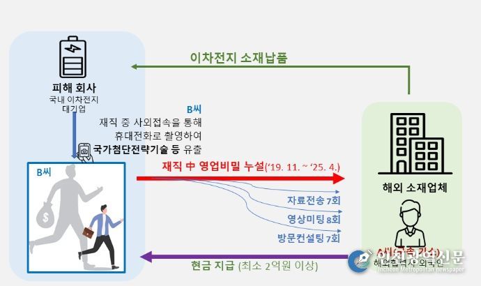 기술경찰에 따르면, A씨는 2019년 11월부터 2025년 4월까지 피해회사의 부장급 연구원 B씨(53세)로부터 금품을 대가로 자료전송 7회, 영상미팅 8회, 방문컨설팅 7회 등을 통해서 피해회사의 자료를 빼돌린 혐의를 받고 있다.