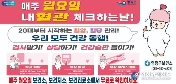 [인천광역신문] 관리자 기자 | 영광군은 심뇌혈관질환 예방을 위해 매주 월요일을‘혈관 건강 체크하는 날’로 지정해 오는 2월 23일부터 본격 추진한다고 밝혔다.
