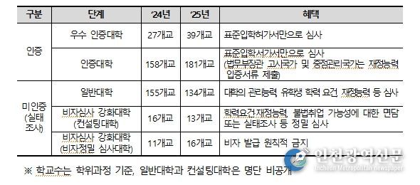 한편, 인증대학 외에 외국인 유학생이 1명 이상 재적 중인 대학에 대해서는 ‘유학생 유치‧관리 실태조사’를 실시하고, 일정 기준을 충족하지 못할 시 비자심사 강화대학(컨설팅대학, 비자정밀 심사대학)으로 지정했다. 이를 통해 대학이 외국인 유학생의 유치 단계에서 어학 능력과 재정 능력 등을 엄격히 심사하도록 하고, 유학생 관리 전반에 대한 대학의 책임을 강화할 예정이다.