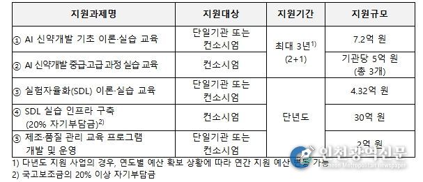 이번 공모를 통해 최대 7개 수행기관을 선정하며, 지원기간은 과제별로 구분하여 지원한다. 지원과제는 AI 신약개발 기초 이론·실습 교육, 중급·고급 과정 실습 교육, 실험자율화 이론·실습 교육, 실험자율화 실습 인프라 구축, 제조·품질 관리 교육까지 총 5개 단위이다.
