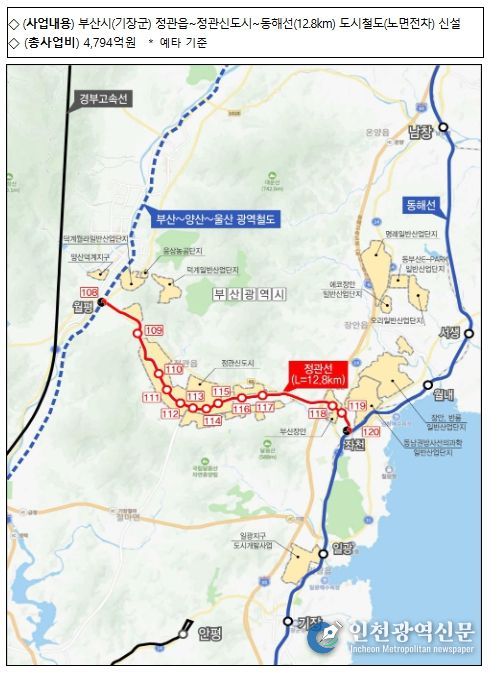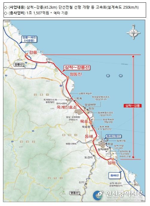 [인천광역신문] 관리자 기자 | 국토교통부는 2월 12일 동해선 삼척-강릉 철도 고속화 사업과 부산도시철도 정관선 건설사업이 사업 타당성을 확보하여 예비타당성조사를 통과했다고 밝혔다.