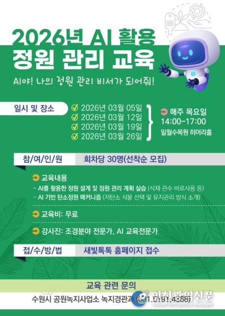 [인천광역신문] 관리자 기자 | 수원특례시는 시민 정원가의 전문성을 높이고 스마트한 정원 문화를 확산하기 위해 ‘인공지능(AI) 활용 정원 관리 교육’을 운영한다.