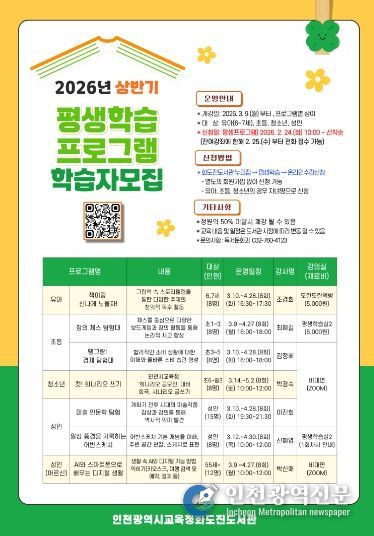 [인천광역신문] 관리자 기자 | 인천광역시교육청화도진도서관은 시민의 다양한 학습 수요를 충족하기 위하여, 오는 24일부터 ‘2026년 상반기 평생학습프로그램’학습자를 모집한다.
