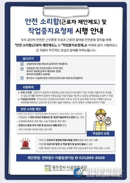 [인천광역신문] 관리자 기자 | 동두천시 시설관리공단은 근로자의 자발적 참여를 바탕으로 안전보건 관리체계를 강화하기 위해 안전보건 제안제도인 ‘안전 소리함’을 운영하고 있다.