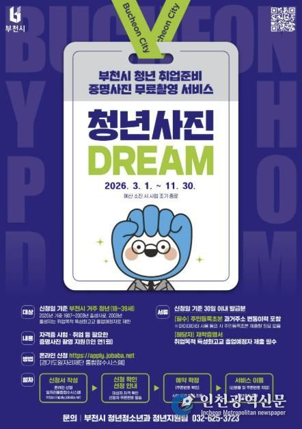 [인천광역신문] 관리자 기자 | 부천시는 청년의 구직활동과 사회진출을 지원하기 위해 자격증 취득과 취업 준비 과정에서 필요한 증명사진 촬영을 지원하는 ‘부천 청년 사진 드림(Dream) 사업’을 추진한다고 13일 밝혔다.