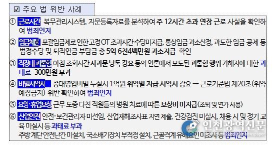 이와 함께 연장·야간·휴일근로 수당 등 임금 미지급 5억 6천4백만원에 대해서도 시정지시했다.