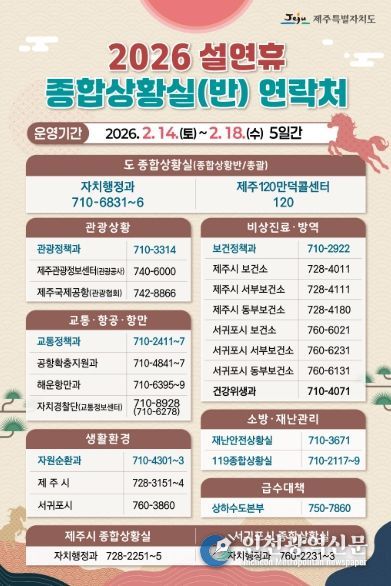 [인천광역신문] 관리자 기자 | 제주특별자치도는 13일 진명기 행정부지사 주재로 ‘2026년 설연휴 종합대책 보고회’를 열고 ‘민생에 온기를, 안전에 안심을 더하는 설명절’을 주제로 분야별 세부 추진계획을 점검했다.