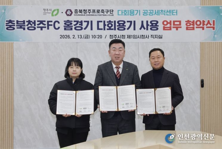 [인천광역신문] 관리자 기자 | 청주시는 13일 충북청주 프로축구단(충북청주FC), 다회용기 공공세척센터와 함께 충북FC 홈경기 다회용기 사용 확대를 위한 업무협약을 체결했다.