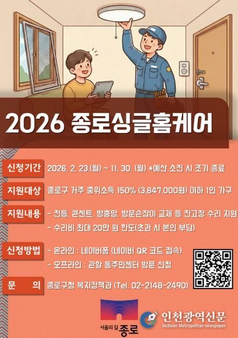 [인천광역신문] 관리자 기자 | 종로구는 1인가구의 생활 불편을 해소하고 안전한 주거환경 조성을 위해 2월 23일부터 11월까지 소규모 고장 수리 지원사업 ‘종로 싱글홈케어’를 추진한다.