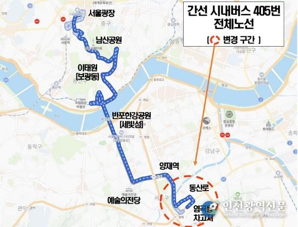 [인천광역신문] 관리자 기자 | 서울 서초구는 양재2동 동산로 일대의 대중교통 이용 불편을 해소하고 주민 이동 편의를 높이기 위해 2월 20일 금요일 첫차(04:10)부터 시내버스 405번(삼성여객) 노선 중 동산로 구간을 양방향 운행으로 조정한다고 밝혔다.