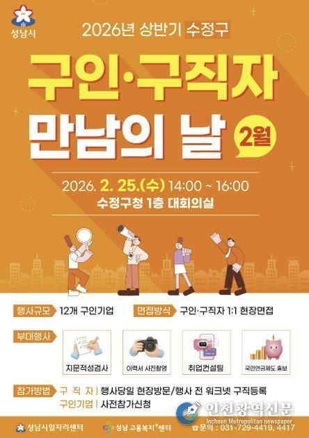 [인천광역신문] 관리자 기자 | 성남시는 시민의 취업을 지원하고 지역 기업의 인력난 해소를 위해 오는 2월 25일 오후 2시부터 4시까지 수정구청 1층 대회의실에서 ‘구인·구직자 만남의 날’ 행사를 연다.