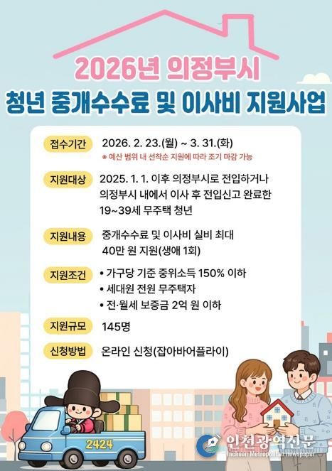 [인천광역신문] 관리자 기자 | 의정부시는 청년들의 주거 이전 비용 부담을 줄이기 위한 ‘2026년 청년 중개수수료 및 이사비 지원사업’의 신청자를 모집한다.
