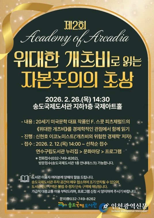 [인천광역신문] 관리자 기자 | 연수구 송도국제도서관은 오는 26일 14시 30분, 인문학 프로그램 ‘제2회 아카데미 오브 아르카디아(Academy of Arcadia)’를 개최한다.