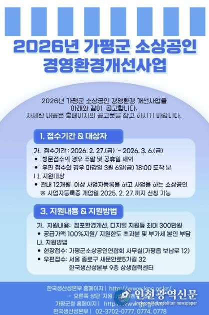 [인천광역신문] 관리자 기자 | 가평군은 관내 소상공인의 지속경영 기반을 강화하기 위해 ‘2026년 가평군 소상공인 경영환경개선사업’ 대상자를 3월 6일까지 모집한다고 밝혔다.